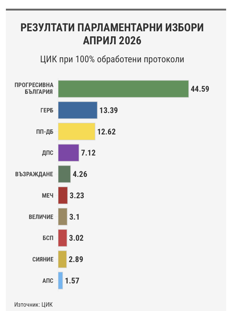 Ein-Kammer-System, 240 Sitze, gewählt am 26. März 2017 (s.u.) bei vorgezogenen Parlamentswahlen. Das Parlament ist gewählt für vier Jahre. Es ist das 44. Parlament in der bulgarischen Geschichte. Fünf Parteien und Bündnisse haben die 4 %-Hürde übersprungen: